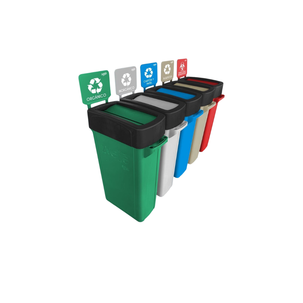 Color: Verde para residuos orgánicos, gris para residuos inorgánicos, azul para cartón y papel, capuchino para plásticos y rojo RPBI.