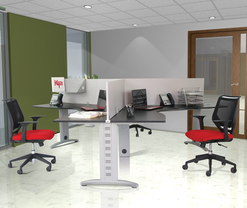 Estructura: doble metálica con faldón y larguero pasa cables, disponible en color negro y gris.