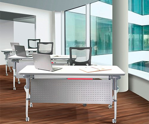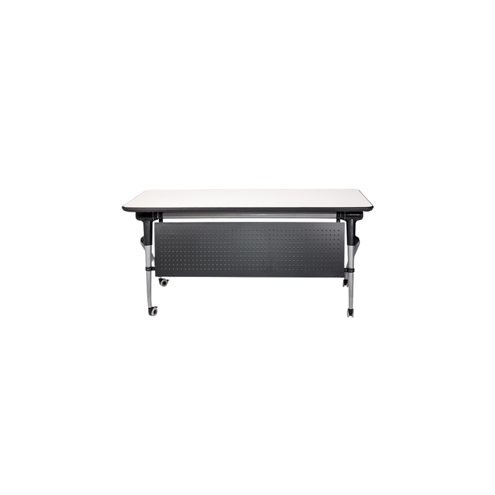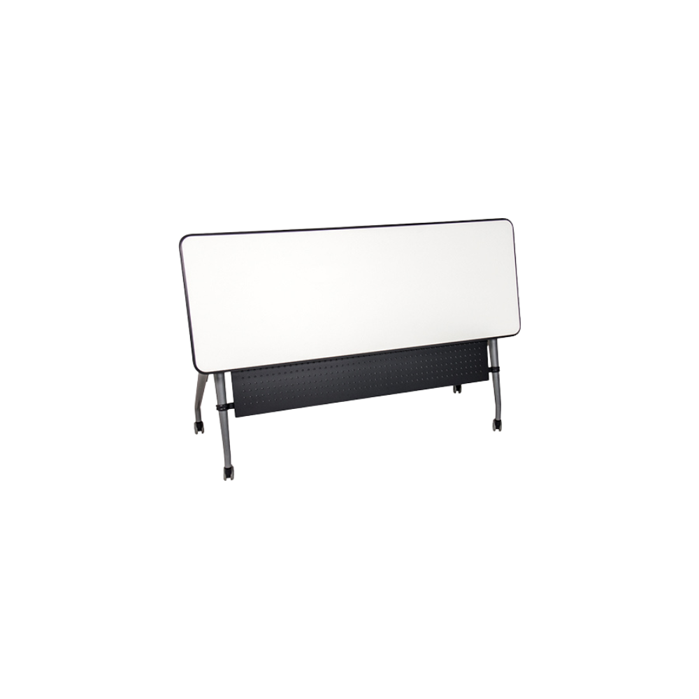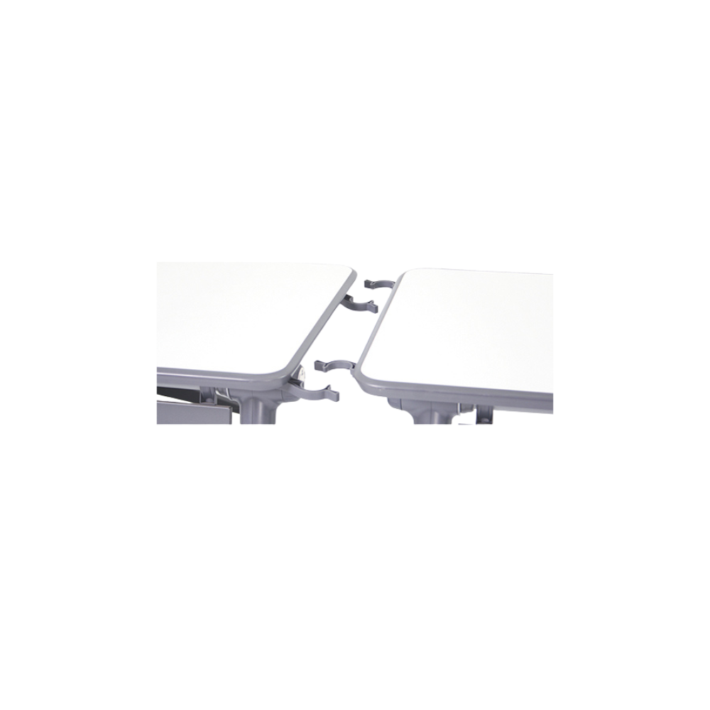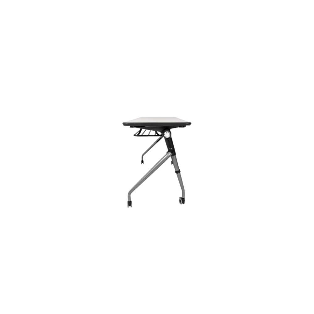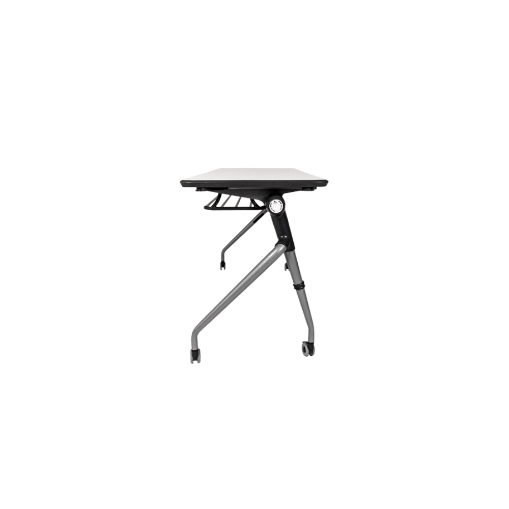 Escritorio: escritorio abatible con rejilla porta papeles, rodajas con freno, mecanismo de unión mesa con mesa.