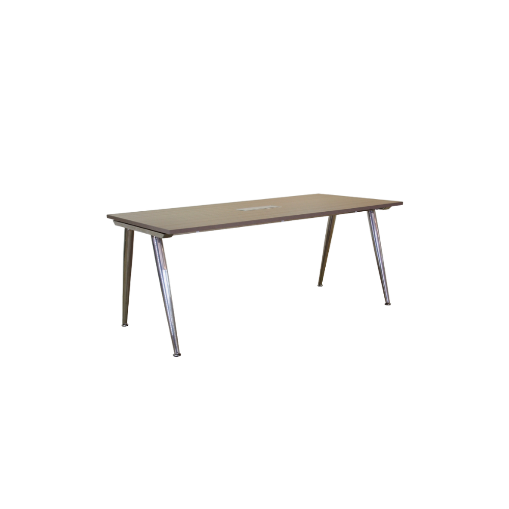 Estructura: mesa de juntas con patas metálicas y cubierta de melámina.