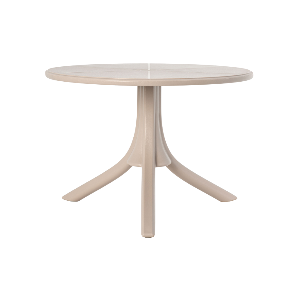 Mesa: en polipropileno de alta resistencia y duración para intemperie e interior, resistente a los rayos ultravioleta (UV) y al ambiente salino; ajustable en dos alturas.