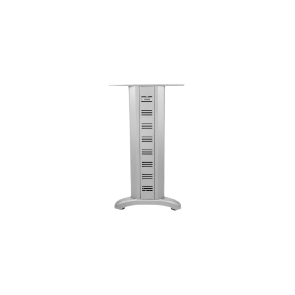 Estructura: pata metálica compuesta de 3 partes; base, columna con rejilla pasacables y soporte para cubierta.