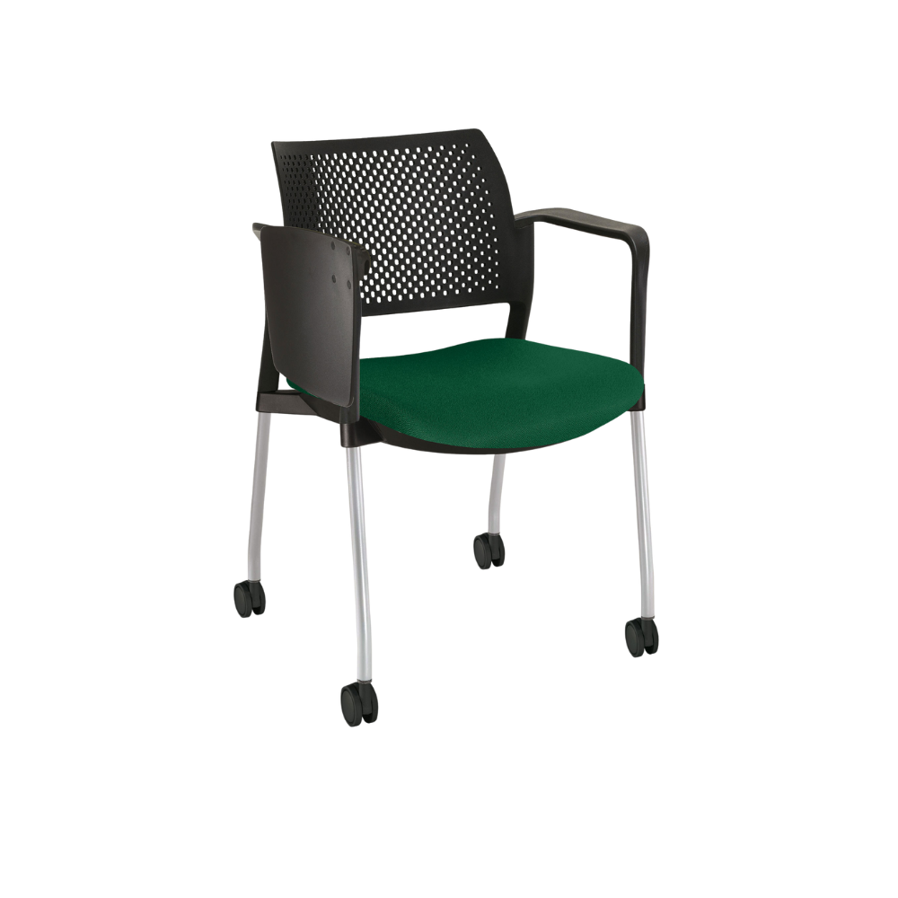 Estructura: de acero tubular de 7/8" de diámetro, calibre 14; con acabado en pintura epóxica (electrostática) color negro mate o gris, con rodajas giratorias tipo dual en color negro, con descansabrazos de polipropileno en color negro y con paleta lateral antipánico en color negro fijada al brazo mediante un dispositivo.