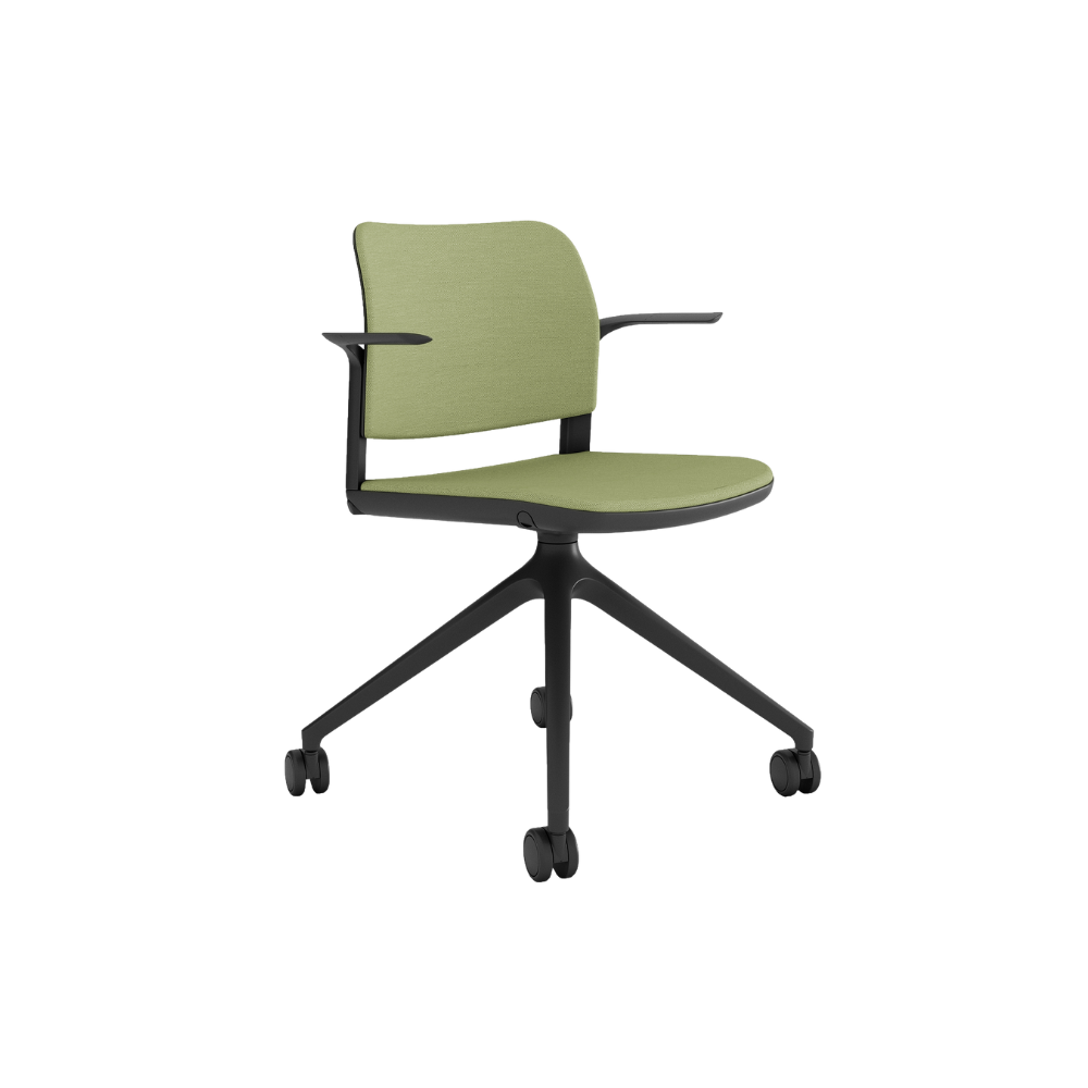 Asiento y respaldo: en copolímero de polipropileno virgen de alta densidad, diseño Ergonómico, asiento giratorio 360°. Acojinado con hule espuma laminada y dimensionada en 30 mm de espesor, de alta densidad (60 Kgs/m3) y de alta resiliencia.